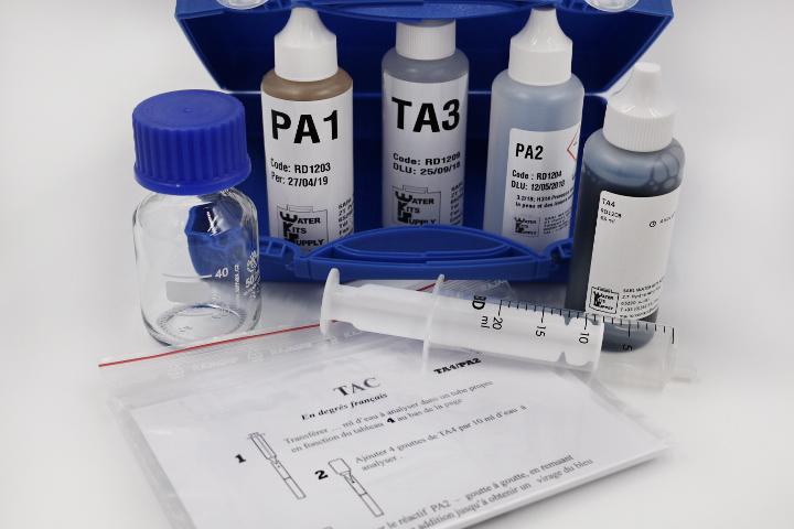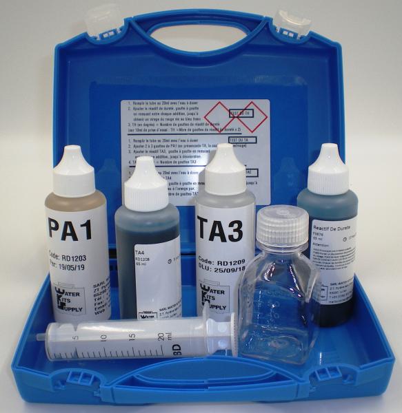 Valise TA, TAC et TH avec flacons 65ml TA TAC : 1 gte de TA3 = 2°f sur 10ml ou 1°f sur 20ml ou 0,5°f sur 40ml TH : 1 gte de réactif TH = 2°f ...